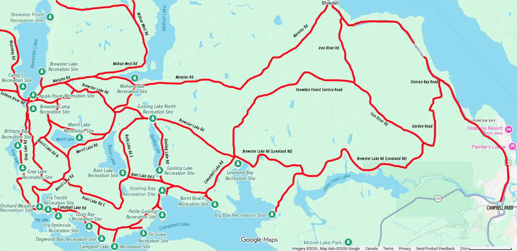 Another route you can take is about 2km past the Duncan Bay Rd turnoff. Make a left onto Iron River Road and follow this road for 4 kilometres then turn right onto Snowden Forest Road. Stay on this route for about 9 to 10 kilometres until you arrive at the Loveland Bay and Brewster Road junction, where it transitions into Campbell Lake Main. Continue to 2.25km and take the left-hand turn. You will see the Burnt Beach sign on a tree at the entrance.